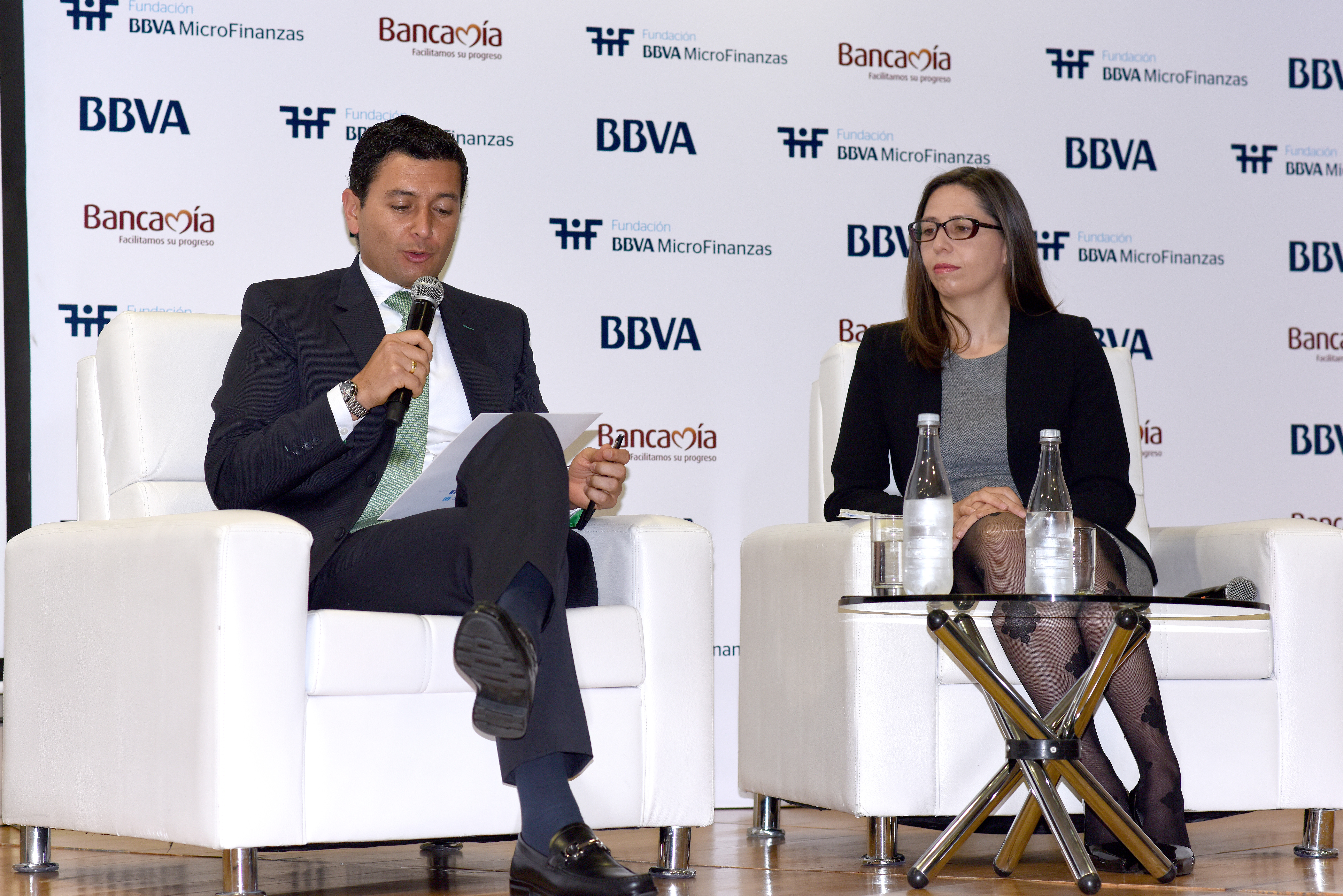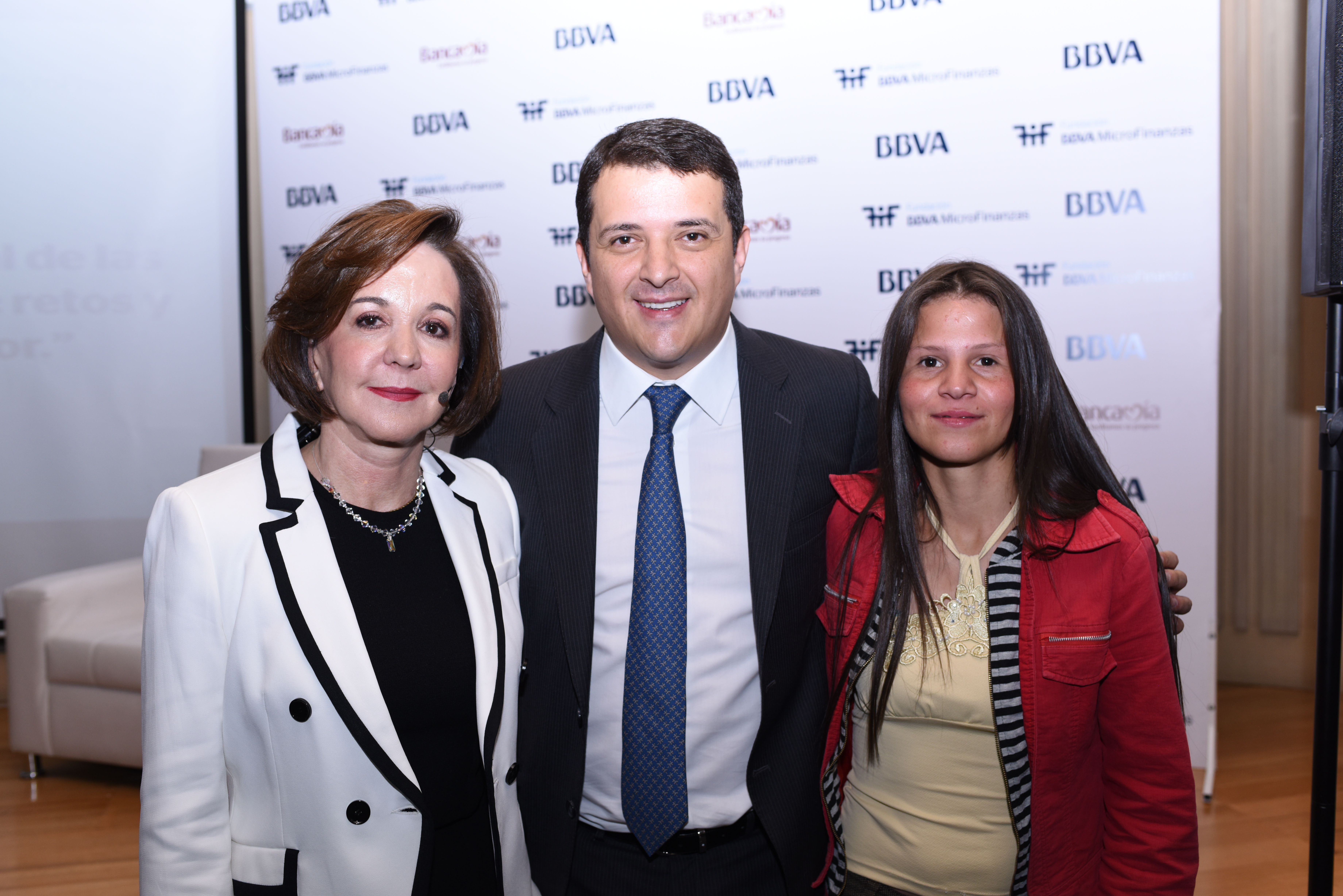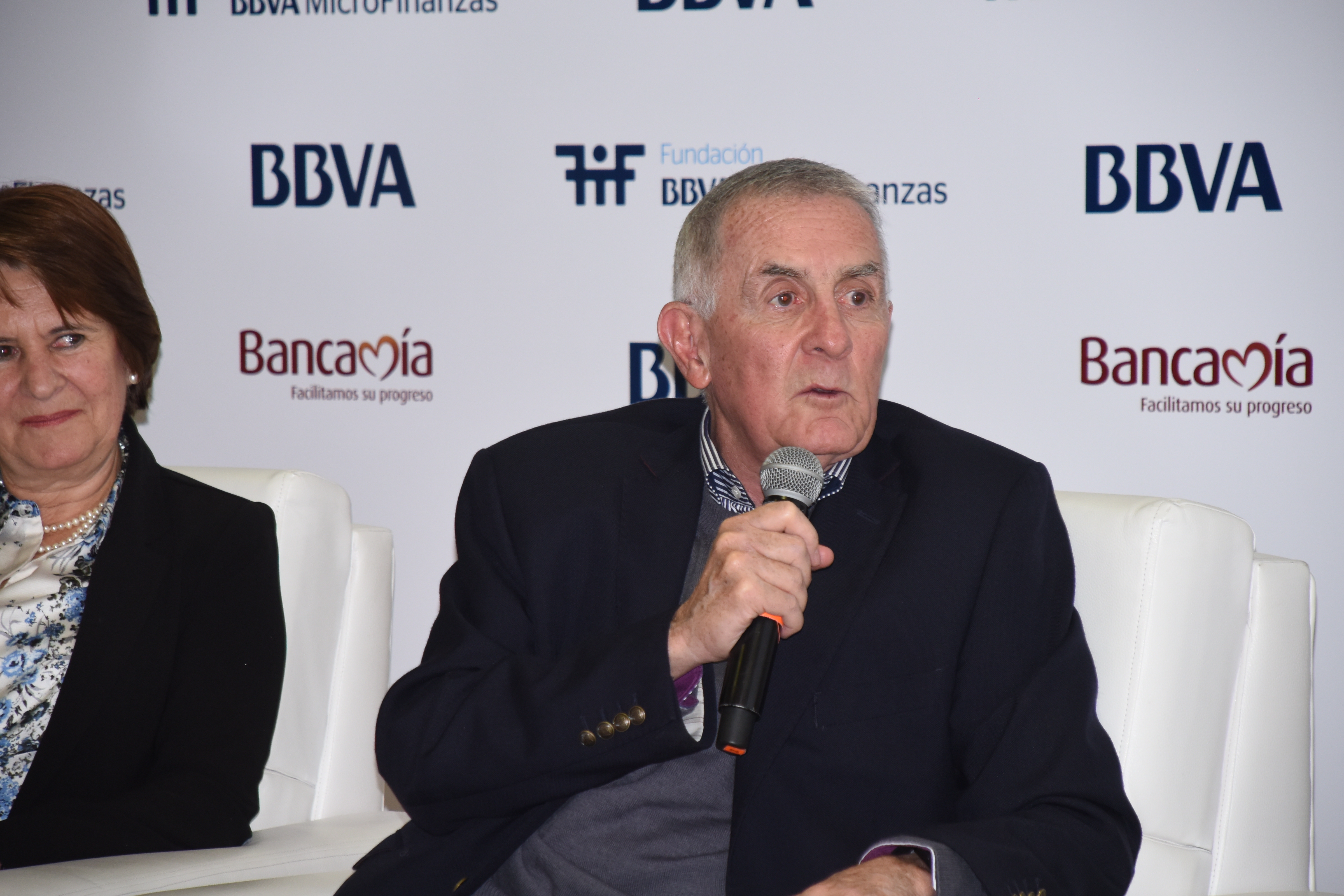 - Jessica, an entrepreneur and client of Bancamía, shares her experience with the BBVAMF. On the right, Miguel Ángel Charria, executive president of Bancamía