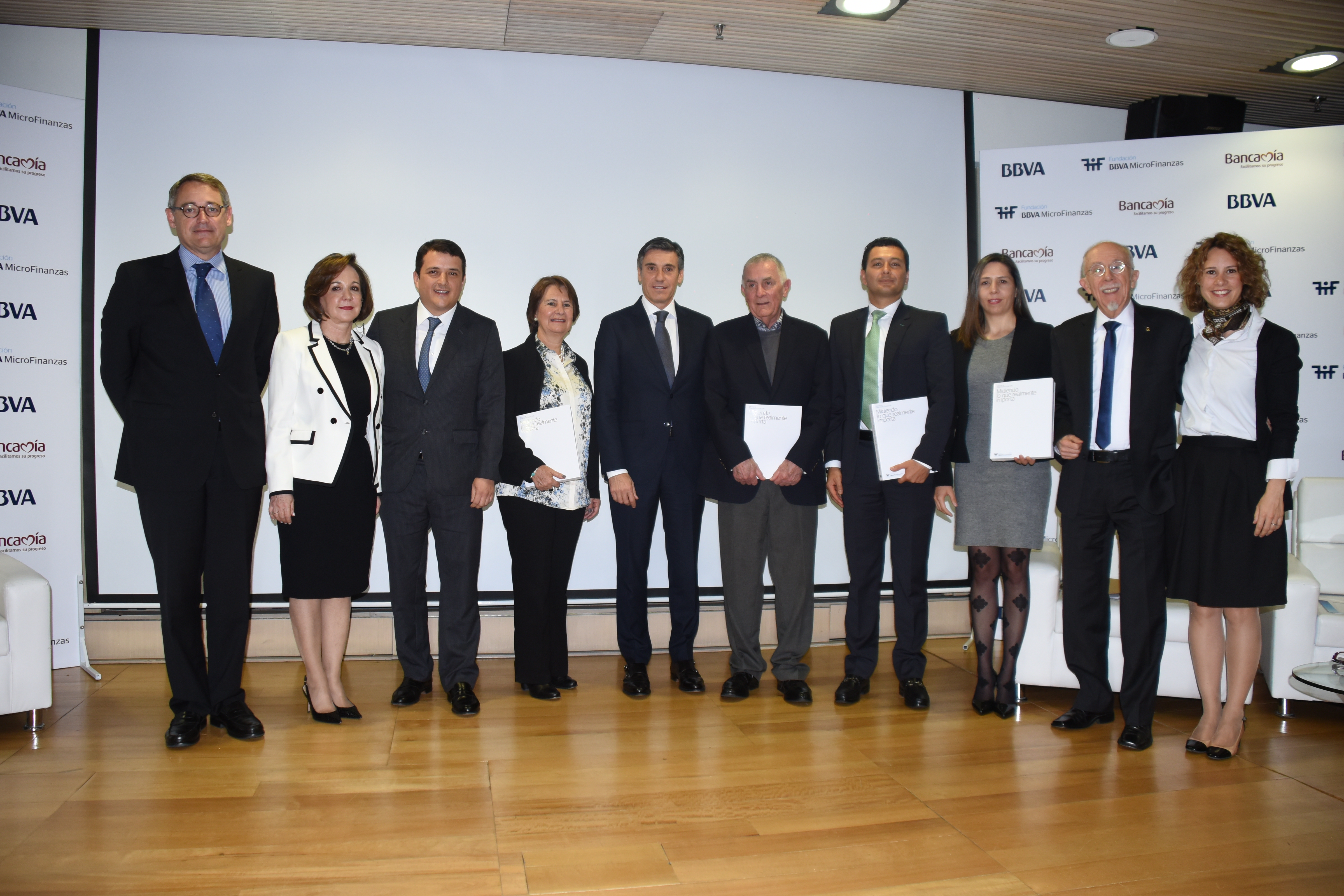 - Javier M. Flores, BBVAMF CEO, with the participants of the presentation, pose with the 2016 Social Peformance Report