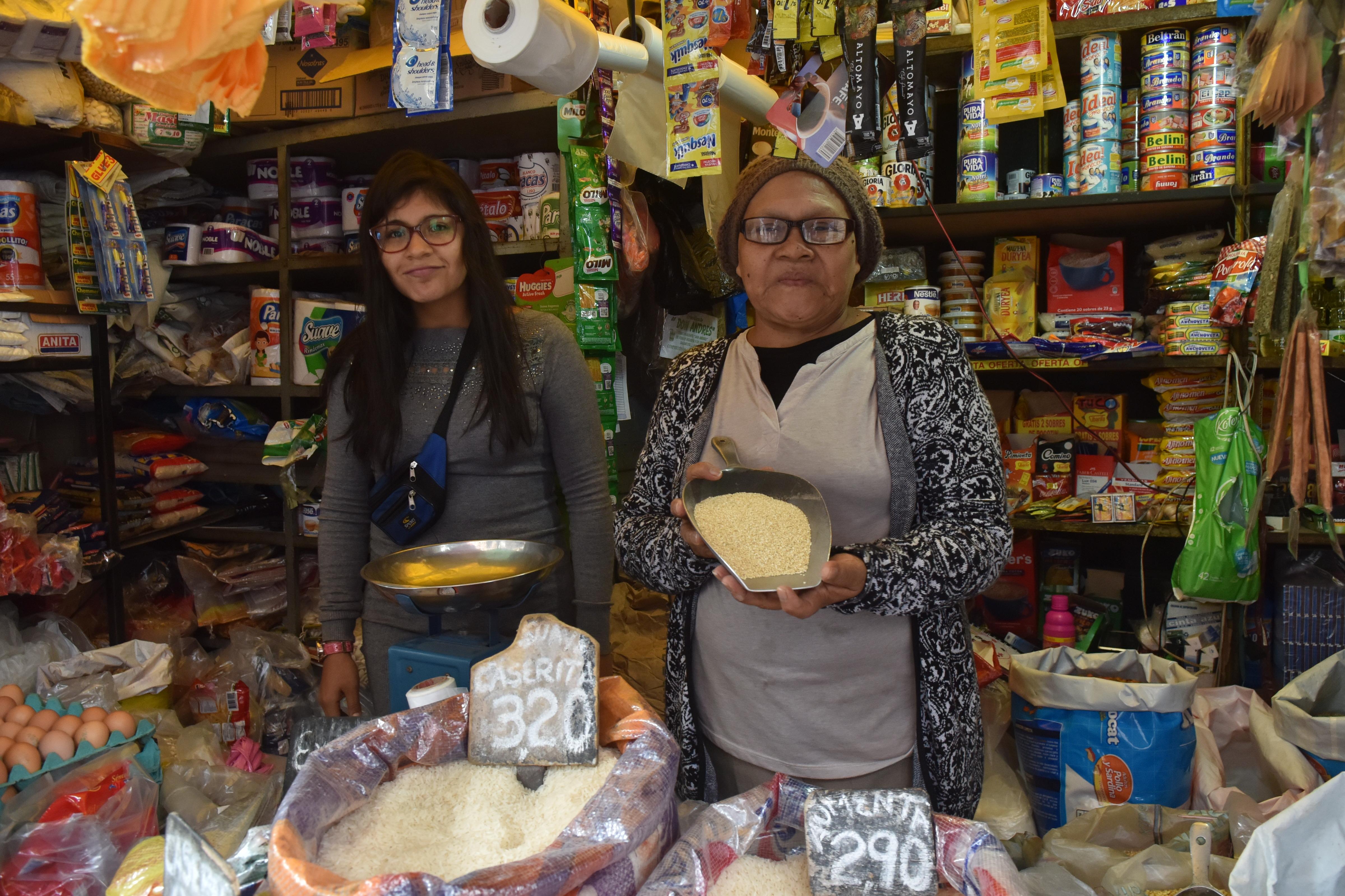 - Elena Ayala, emprendedora de Financiera Confianza, junto a una de sus hijas en su pequeño negocio