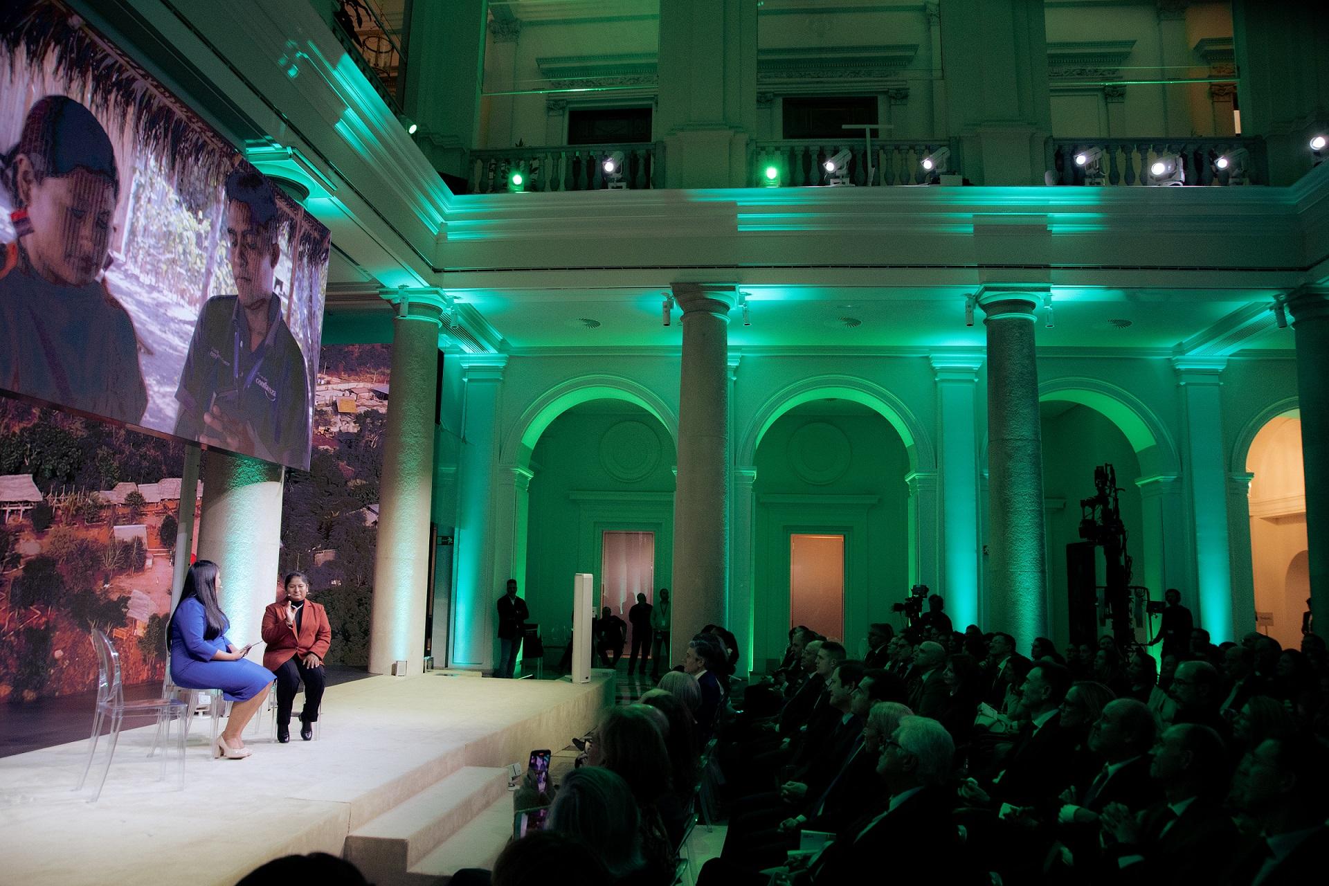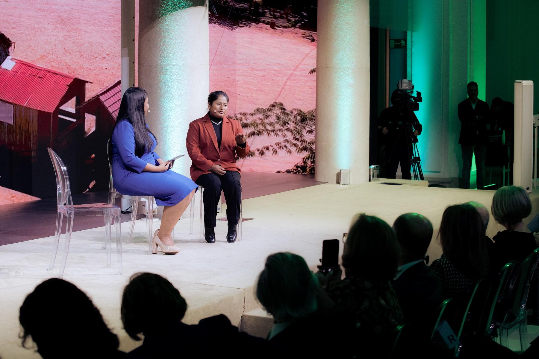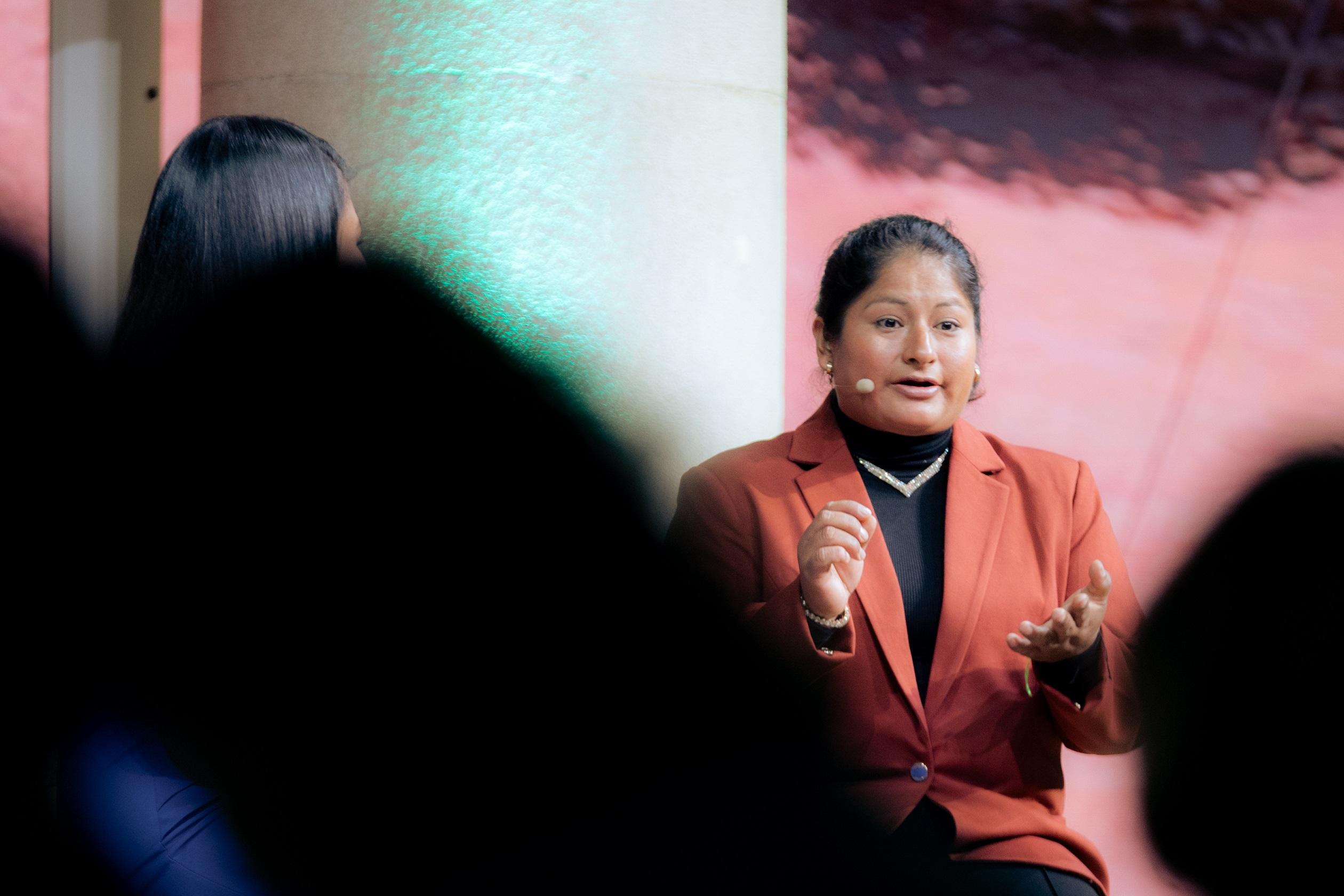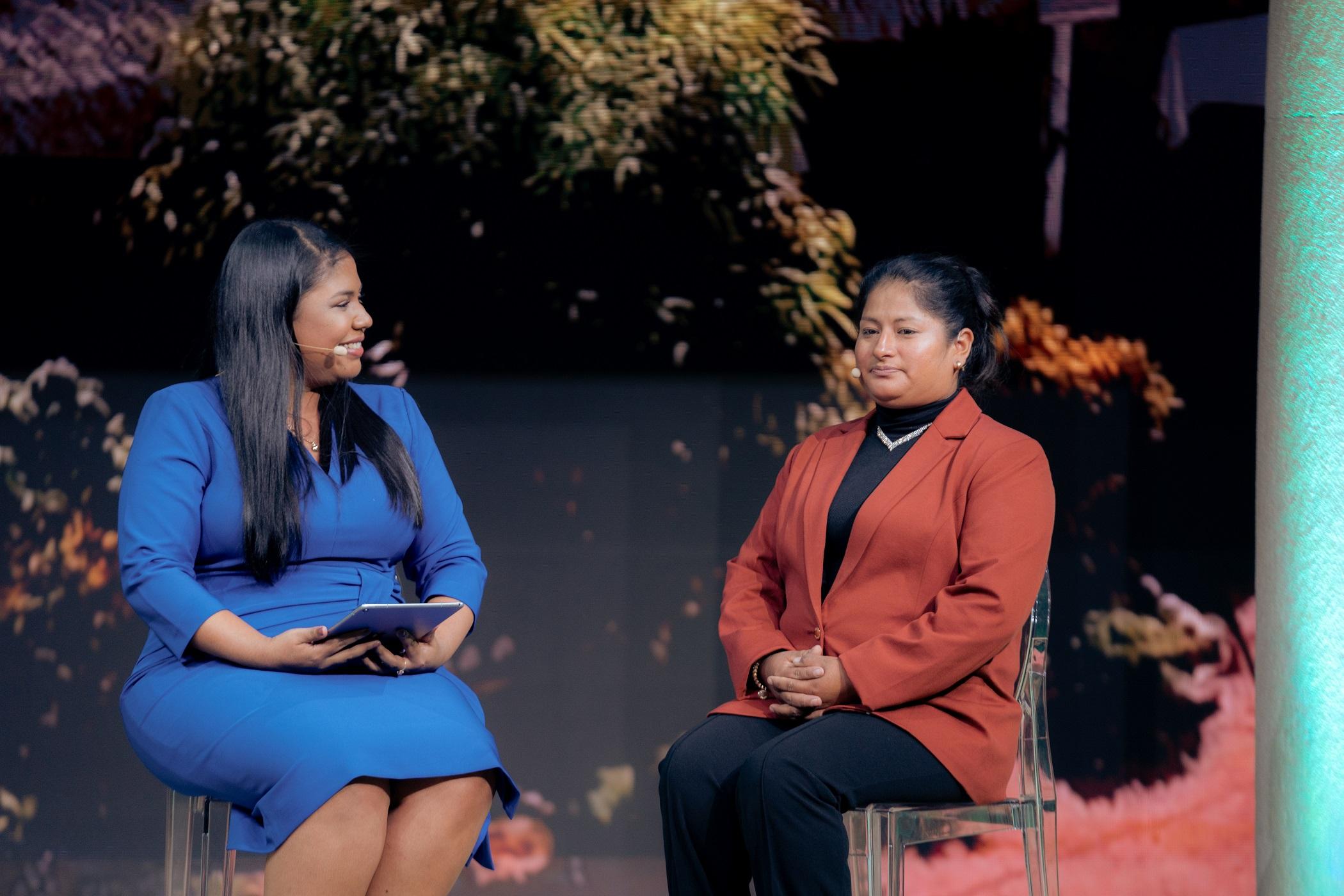- María Jorge, emprendedora peruana de la etnia Asháninka, en un conversatorio con Elizabeth Prado, moderadora
